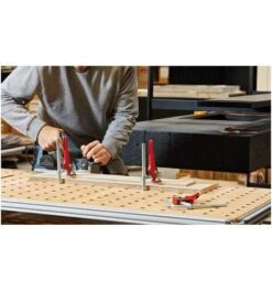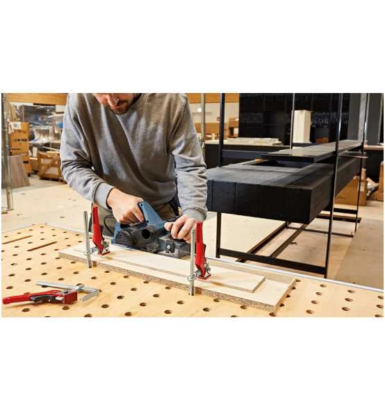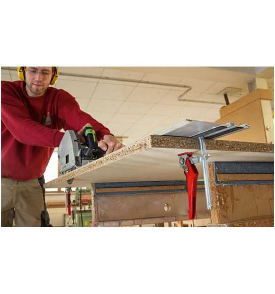 Zum sicheren Fixieren von Führungsschienen der Marken Festool, Protool, Metabo, Makita, Hitachi, etc. und zum Spannen in Profilen sowie auf Arbeitstischen