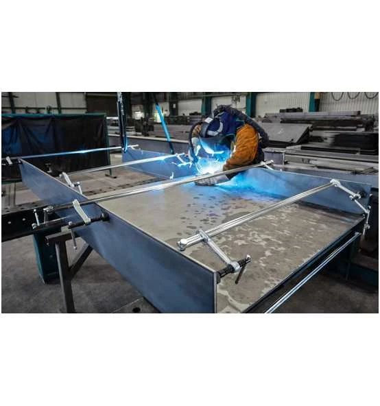 Mittige Position am Werkstück verhindert das Kippen. Werkzeugloses Umspannen zum Spreizen. Zwinge kann durch eine Öffnung am Werkstück geschoben werden. Hitzebeständige Spezialdruckplatte mit Sinterstahleinlage. Schwenkbar bis 35°. Spannkraft bis 6500 N, Länge 3000 mm bis 9000 N. Vielseitige Einsatzmöglichkeiten durch austauschbare Gleitbügel.