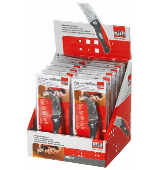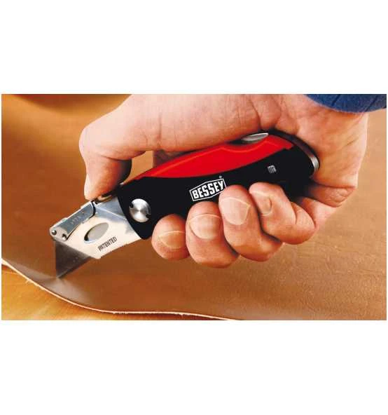 Komfort-Kunststoffgriff. Klingenfach mit 5 Trapezklingen. Daumenkissen für max. Anpressdruck. Gürtelclip.
