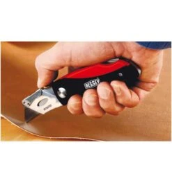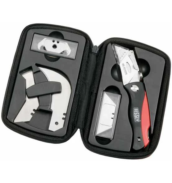 Komfort-Kunststoffgriff. Klingenfach mit 5 Trapezklingen. Daumenkissen für max. Anpressdruck. Gürtelclip. Lieferung in Nylontasche.