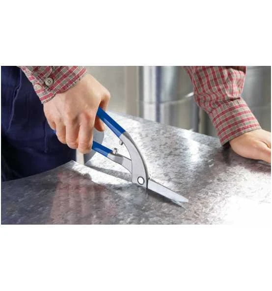 Schneiden induktiv gehärtet (HRC 54-56). Im Gesenk geschmiedet. Für lange gerade und durchlaufende Schnitte in Blech bis 1,0 mm, rostfreie Edelstahlbleche bis 0,8 mm.