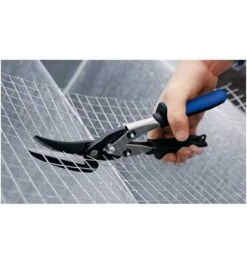 Aus Edelstahl, mit Hebelübersetzung, Scherenkopf im Gesenk geschmiedet, verschleißfest durch zusätzliche Induktivhärtung der Schneiden (mind. 58 HRC), 75 mm lange und seitlich abgesetzte Schneiden, stabile verwindungssteife Stahlgriffe, glanzvernickelt, ergonomisch geformte Griffhüllen mit handschonender Weichstoffeinlage und Abgleitschutz, verschlusssicherer Riegel, innenliegende integrierte Stahlfeder zum selbsttätigen Öffnen der Schere, Aufhängeöse.