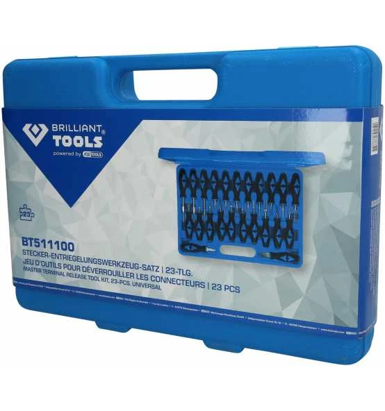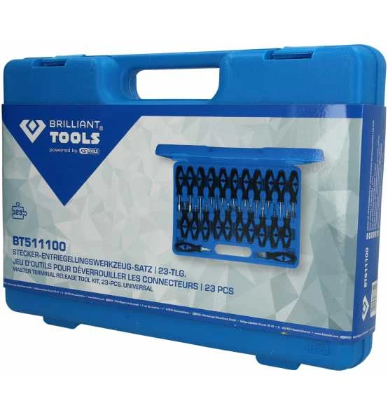 Der BRILLIANT TOOLS Entriegelungswerkzeug- Satz BT511100 ist unentbehrlich für alle Mechatroniker und KFZ- Elektriker. Das universelle Sortiment ist für nahezu alle Fahrzeuge geeignet und hilft Ihnen bei der Reparatur von Kabel- oder Steckverbindungen. Durch Korrosion verursachte Verbindungsdefekte am ABS, an Klimasensoren, an Parc Distance Contol (PDC) Sensoren, am Anhängerkupplungsmodul etc. sind häufige Fehlerquellen, die mit dem passenden Entriegelungswerkzeug schnell behoben werden können. Zur Aufbewahrung ist der praktische Kunststoffkoffer im Lieferumfang enthalten. So haben Sie immer alle Werkzeuge zusammen und griffbereit.