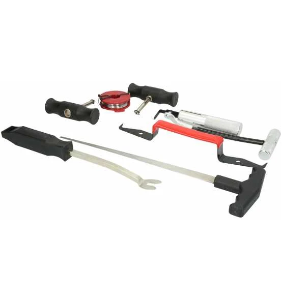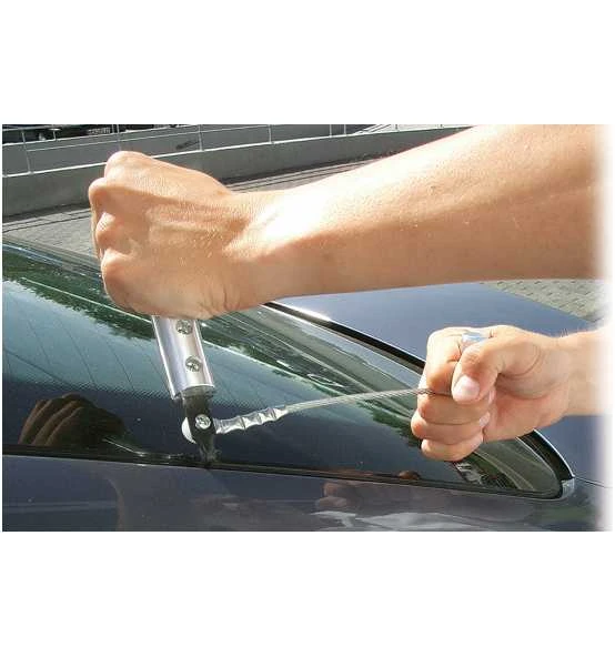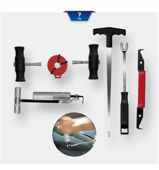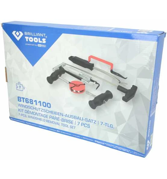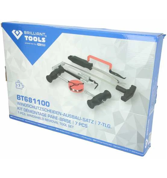 Der BRILLIANT TOOLS Windschutzscheiben-Ausbau-Satz BT681100 ist unentbehrlich zum Austrennen von Front- und Heckscheiben. Schnell ist es passiert, dass aus einem Steinschlag eine gerissene Scheibe wird. Dann ist der Austausch unerlässlich. Die geklebten Scheiben können mühelos zu zweit, mit dem Dreikant-Ziehdraht und den zwei Griffen, oder alleine mit dem Ziehmesser rausgeschnitten werden. Um Verkleidungen zu lösen ist ein Clipheber im Lieferumfang enthalten. Der Doppelhaken kann für Dichtgummis oder ähnliches genutzt werden.
