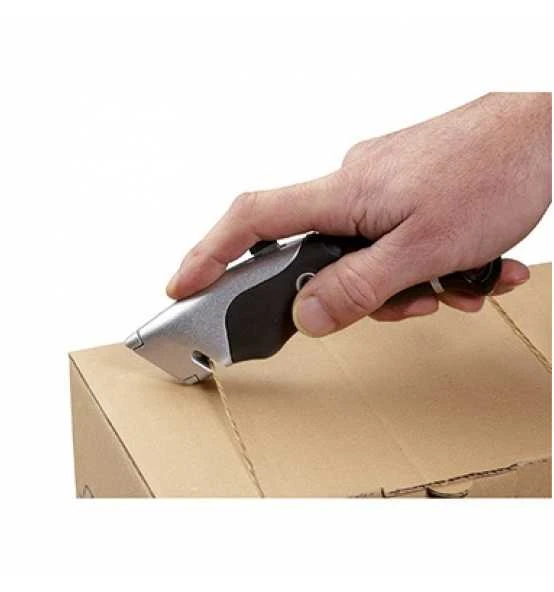 Einfacher und werkzeugloser Klingentausch. Zerschneiden von Packschnüren mit zurückgezogener Klinge möglich.
