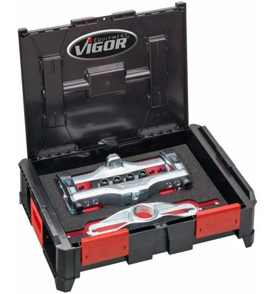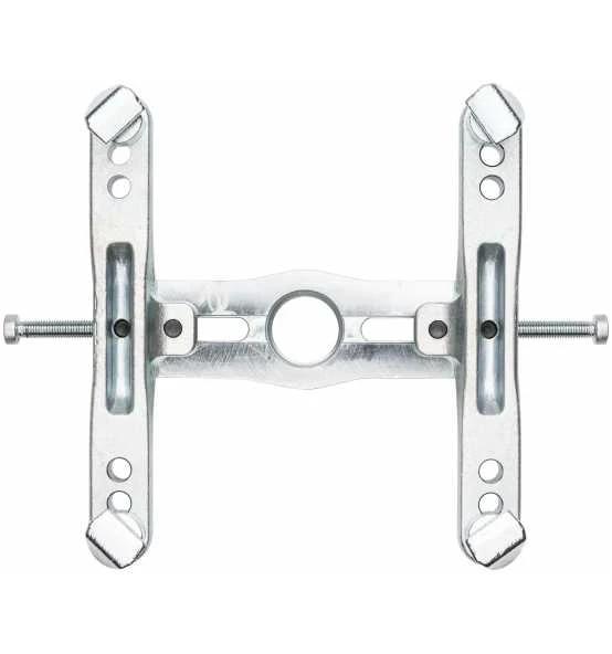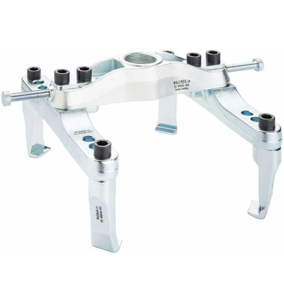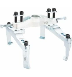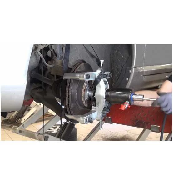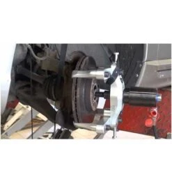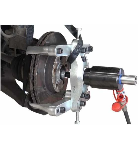 - Übertragung von gleichmäßigem Druck über die Auspress-Füße auf die Bremsscheibe. Hydraulik-Zylinder stützt sich mittels Adapterstück an Antriebswellen-Verschraubung ab