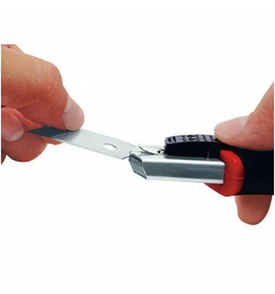 Mit automatischem Klingentausch aus integriertem Magazin. Klingenführung aus Metall. Mit Rastervorschub und Auto-Stop. Durch das erneute Zurück- und Vorschieben ist die neue Klinge automatisch geladen.